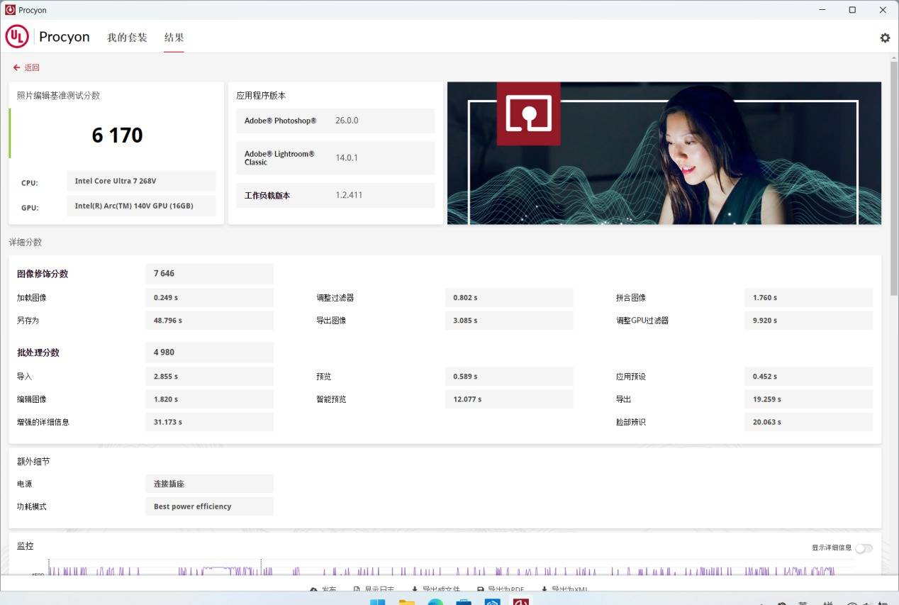 在 UL Procyon 图像编辑基准中获得 6170 分,处理高分辨率图像时响应迅速,单张修饰时间平均小于 1 秒,批量处理和导出也保持稳定效率。