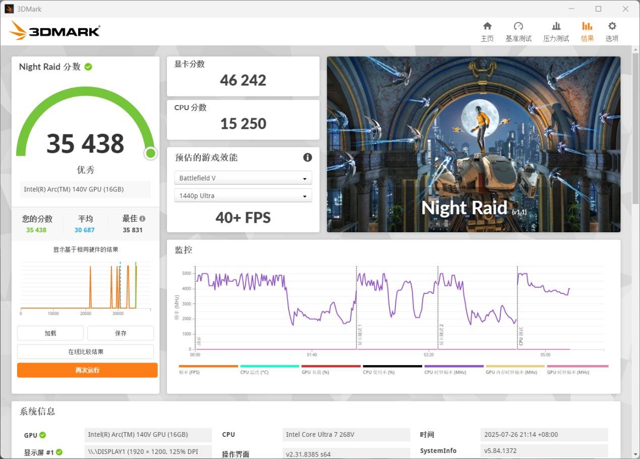 在 3DMark 的 Night Raid 图形测试中,Dell Pro 14 Premium 获得了 35438 的成绩。作为一款主打移动办公和个人应用的轻薄本,这样的图形能力表现已经足以应对日常应用中涉及图形处理的任务,如 PowerPoint 动效预览、图表渲染、网页动画编辑等。