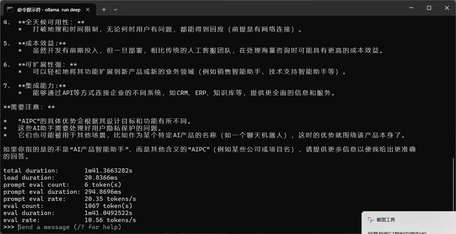 在处理多轮中英文混合的通用问答任务时(如AI定义、应用场景解释等中低复杂度语言推理),这台设备完成了共计1792个 token 的本地推理,耗时约1分41秒。其中 Prompt 输入阶段平均速度为 20.35 tokens/s,生成阶段稳定在 10.56 tokens/s,整体响应迅速,能够胜任日常 Copilot 级别的本地 AI 交互需求。