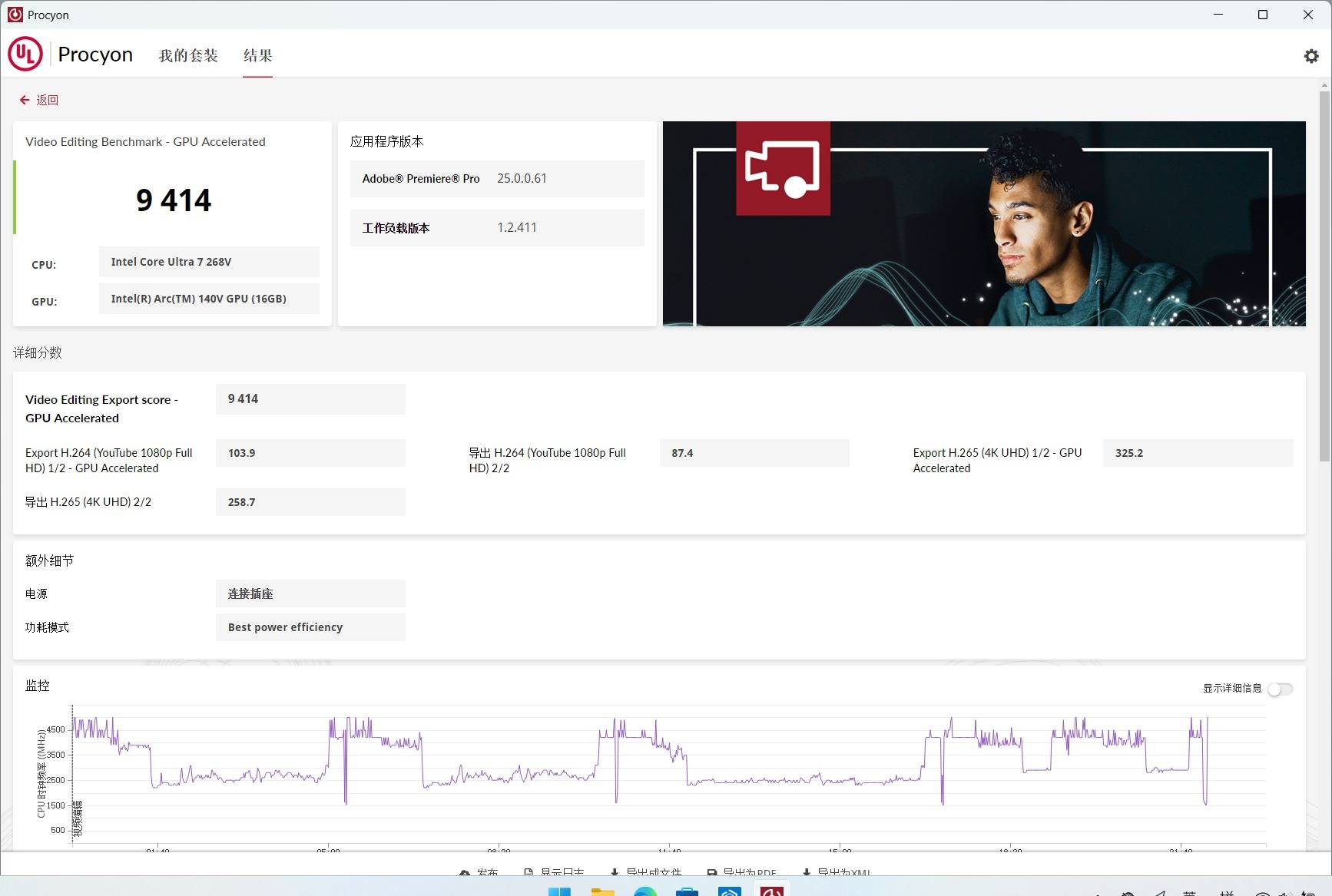 而在视频剪辑测试中取得了 9414 分的成绩,GPU 加速下导出 4K H.265 视频最高可达 325.2 帧/秒,1080P 输出也保持在 87–104 帧/秒的高效水平。