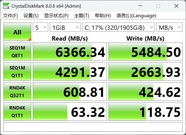 在存储性能方面,Dell Pro 14 Premium 的表现同样可圈可点。实测其内置 SSD 在 CrystalDiskMark 中的顺序读取速度达到 6366.34 MB/s,写入速度也达到 5484.50 MB/s,已经接近 PCIe 4.0 高规格 SSD 的性能上限。这种读写速度可以确保系统在开机、应用启动、文件加载等操作中保持流畅响应。