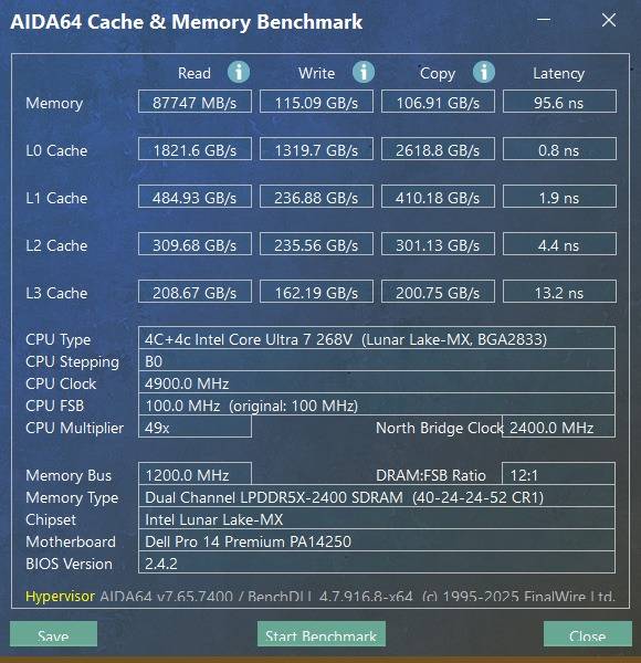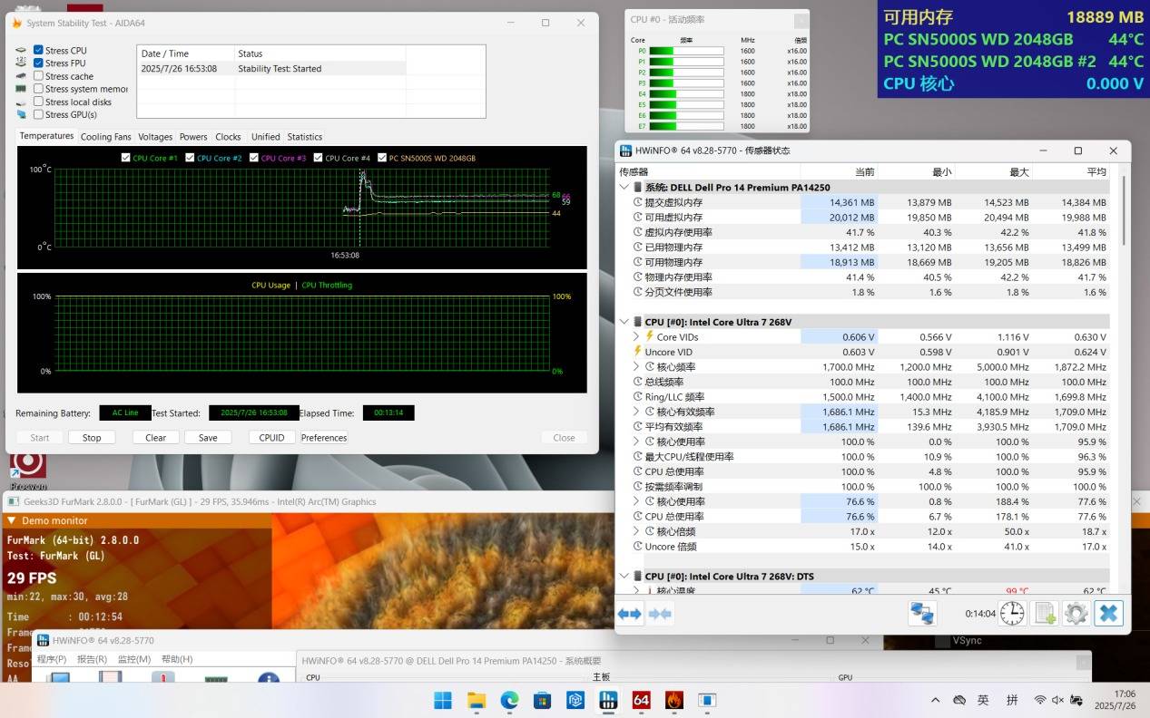 在一台1.17kg的轻薄机身中塞入高性能平台,是Dell Pro 14 Premium的重要价值点之一。我们测试的版本搭载了 Intel Core Ultra 7 268V 处理器、32GB LPDDR5x 8533MHz内存 和 2TB PCIe 4.0 SSD,图形部分则由 集成Arc 140V核显 提供支持。整体硬件配置已经达到了当前轻薄本中的高阶水准,针对多任务办公、轻量创作、影音娱乐与AI办公等场景均有不错表现。
