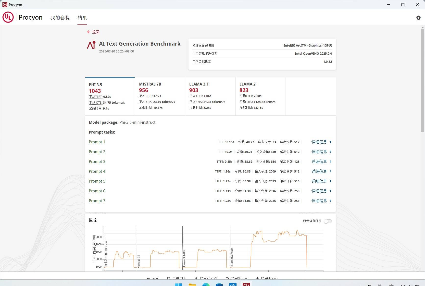 通过 UL Procyon 的 AI Text Generation Benchmark 测试,其在运行轻量 LLM 模型如 Phi-3.5 Mini 时获得了 1043 的综合评分,平均生成速度为 34.75 tokens/s,响应延迟控制在 0.82 秒以内,具备出色的低延迟与响应性能。而面对更大规模的 Mistral 7B、LLaMA 3.1 等模型时,也能维持 20 tokens/s 左右的推理速度,验证了其具备处理中小型模型的持续能力。