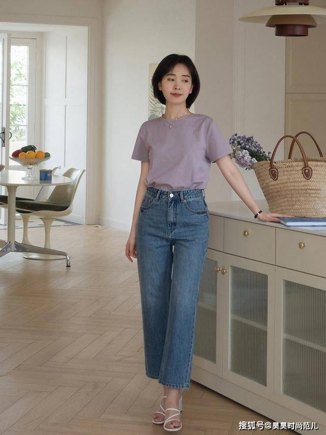 相比于半扎腰穿搭方式的新潮时尚,这种全扎腰的搭配方式,更显成熟,所以出镜率也高了许多。就像这身浅紫色的短袖T恤,搭配高腰直筒牛仔裤穿搭一样。给人一种上短下长的穿搭视觉感,从而轻松提升腰线,显瘦显高。