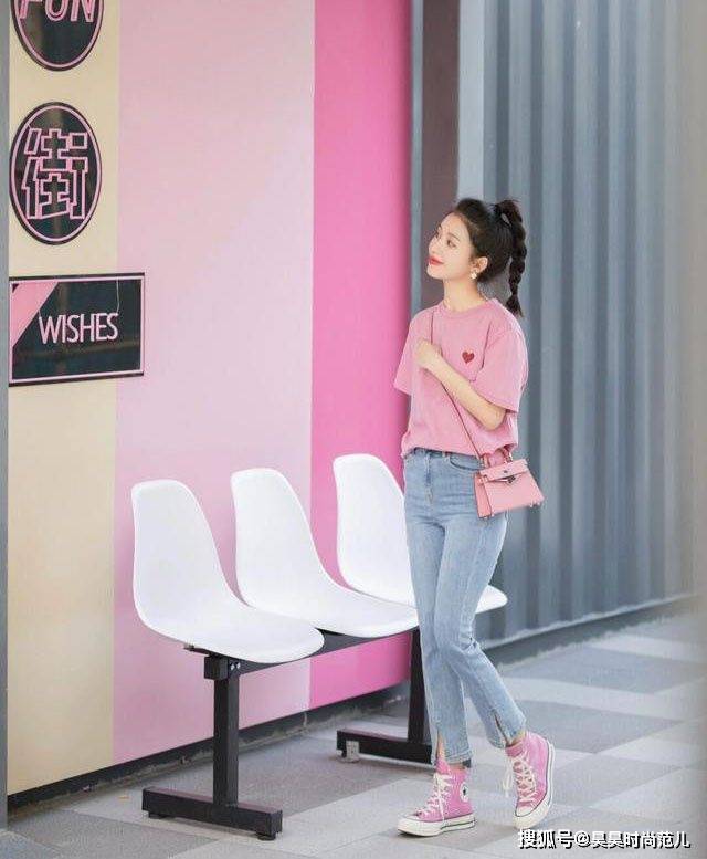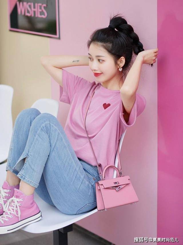 想要把简单的T恤和牛仔裤,穿出时髦感,其实还得借助这种三七分的穿搭法则。比如这身粉色的短袖T恤,搭配开叉微喇牛仔裤穿搭,上短下长的穿搭方式,无论对于小个子还是高个子,都非常友好。