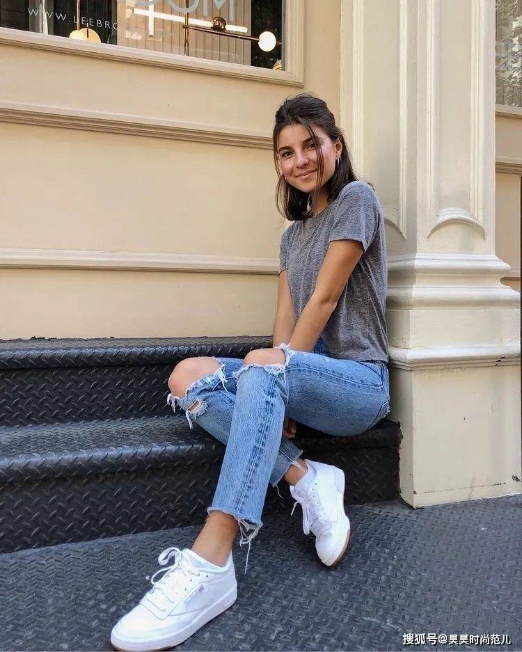 除了清甜减龄的粉色T恤,这种简单沉稳的灰色T恤,穿起来效果也非常不错。烟灰色的沉稳色调,简单百搭,下面搭配一条减龄时髦的破洞牛仔裤和百搭小白鞋穿搭,立马多了几分青春时尚感。