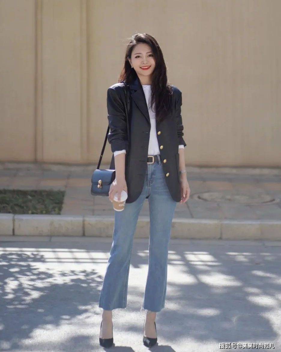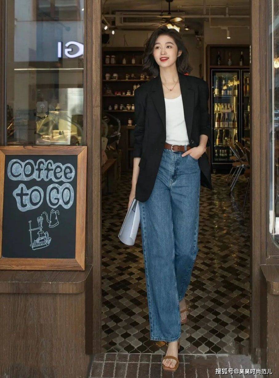 当然,还可以搭配黑色的薄款小西装穿搭,白色的T恤+蓝色的牛仔裤+黑色的小西装穿搭,经典的黑白组合,配上时髦的蓝色牛仔裤,满满的通勤休闲风穿搭,时尚感更强。