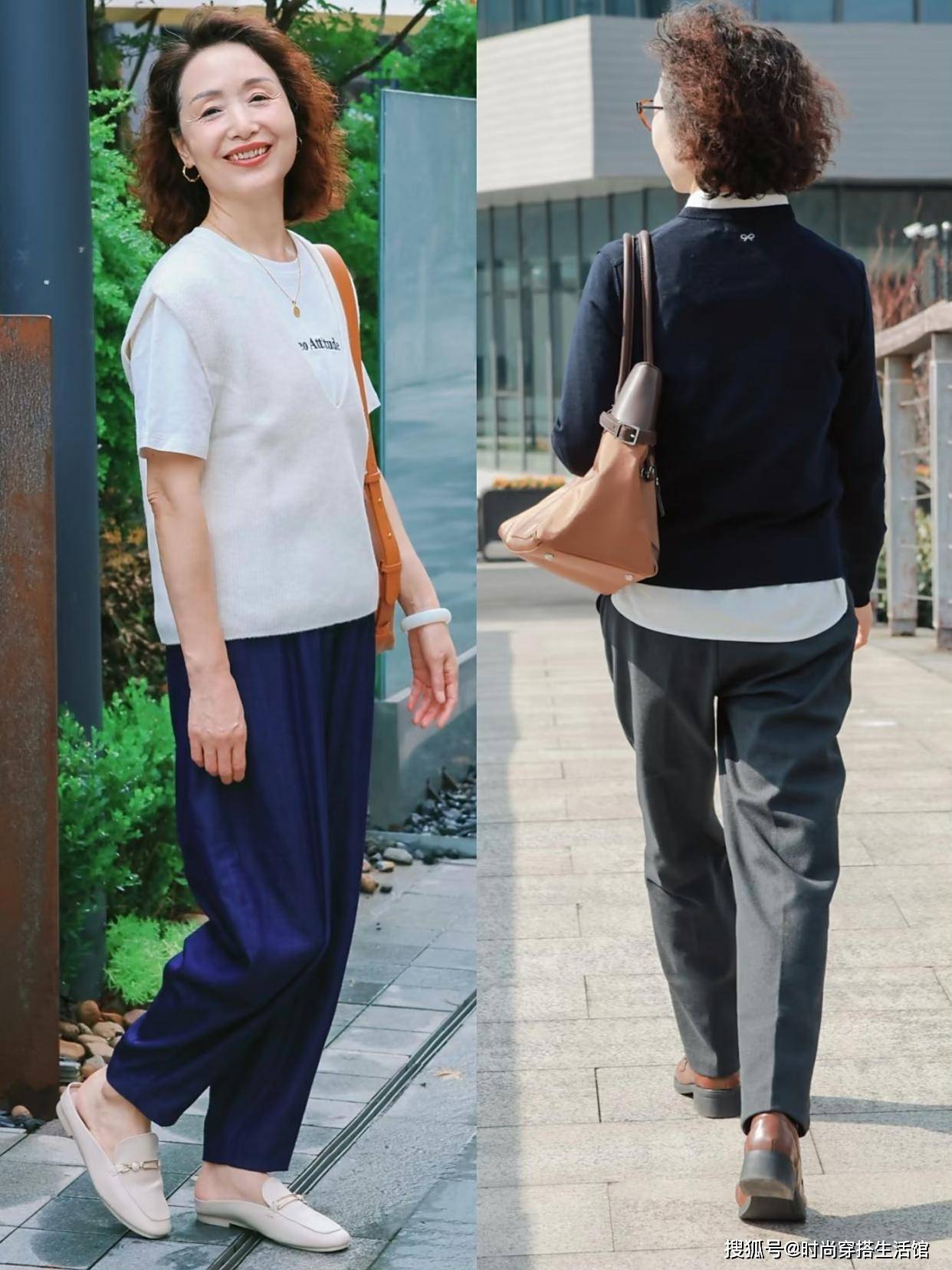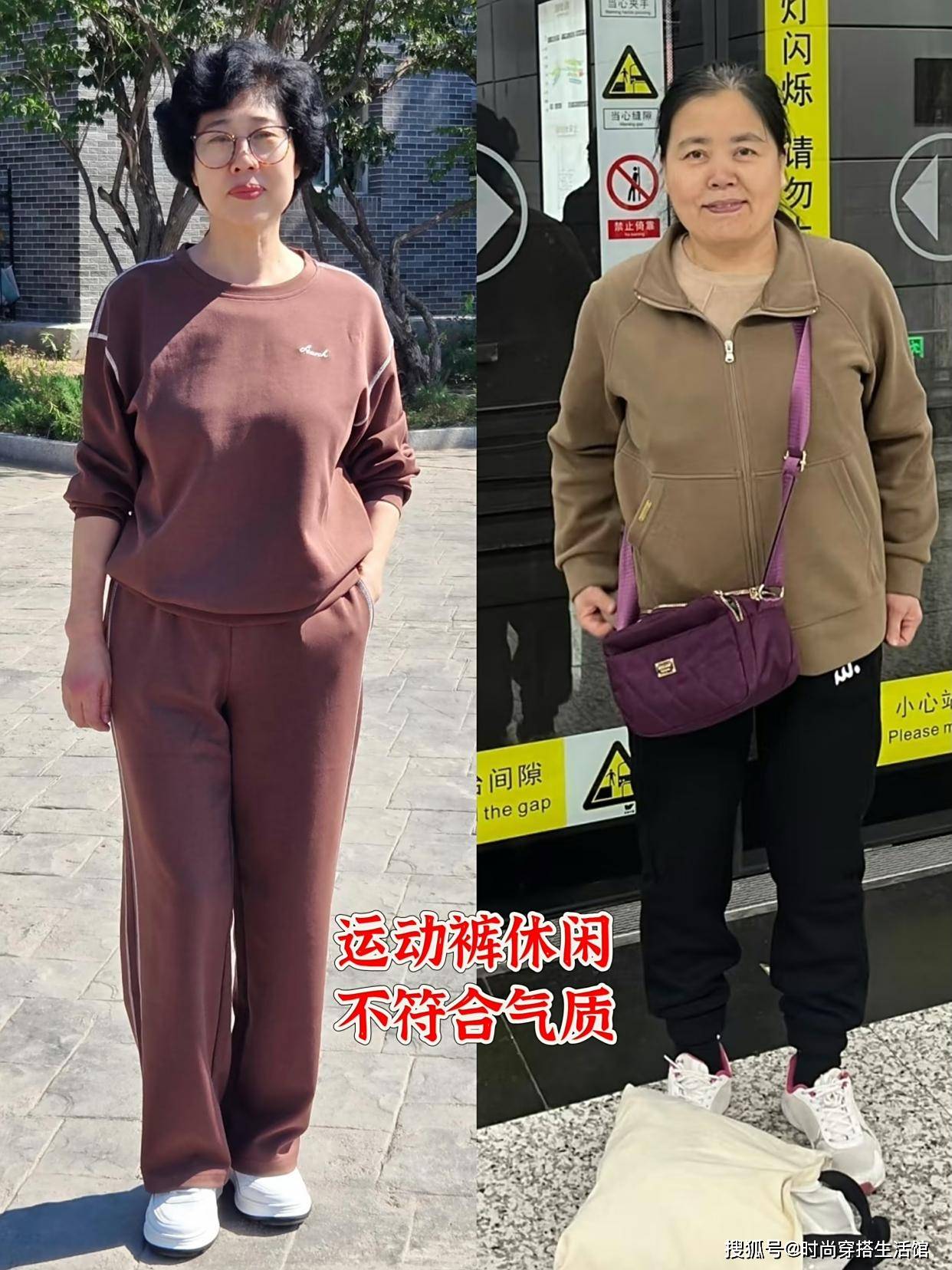 其次就是秋天常见的运动裤基本上版型比较宽松,还采用的是束脚的设计,中年女性穿上后很容易造成视觉臃肿和显胖的效果,其次就是运动裤是休闲风格和中年女性优雅端庄的气质完全不符合,我们要避免选择运动裤上身后拉低气质。