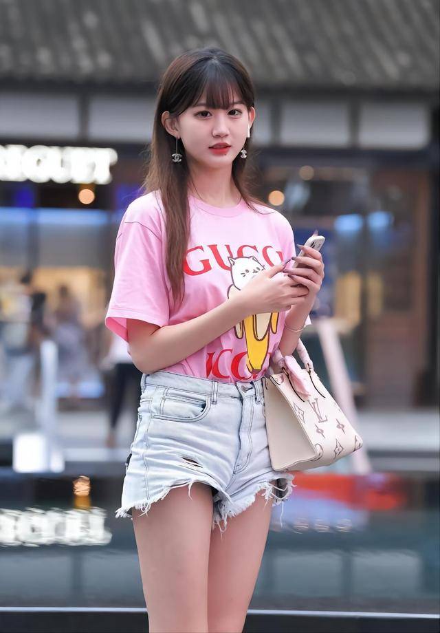 粉色T恤搭配牛仔短裤,穿出十足的气质美,时尚很有活力