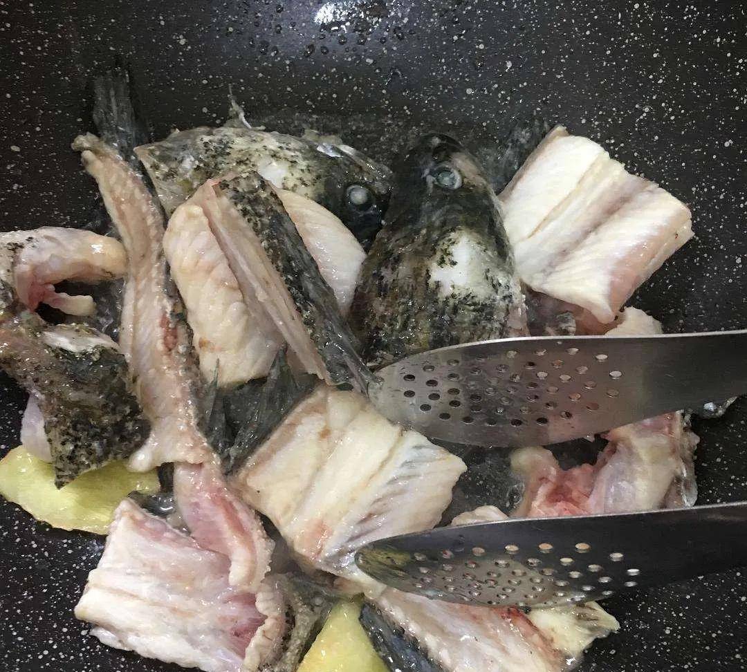 第二步:煎鱼骨头,煎到两面黄金色,快点捞出来!