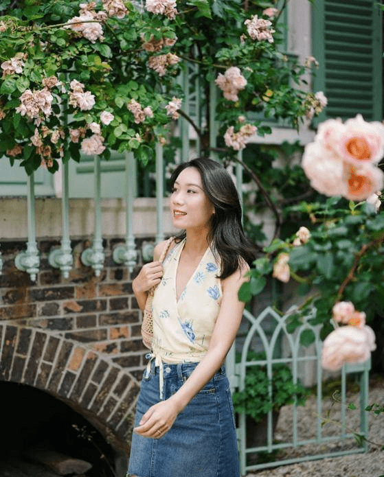 说到法式穿搭自然少不了碎花和牛仔两大自出要素,因为挂脖背心的面料上,穿搭占比也就少,所以因为元素放在挂脖背心上于搭配而言并不会显得复杂。加上具有中性色彩的牛仔面料中和,就能让画面简约且保持相对的质感,这是一组出游也绝不会沦为背景板的穿搭。