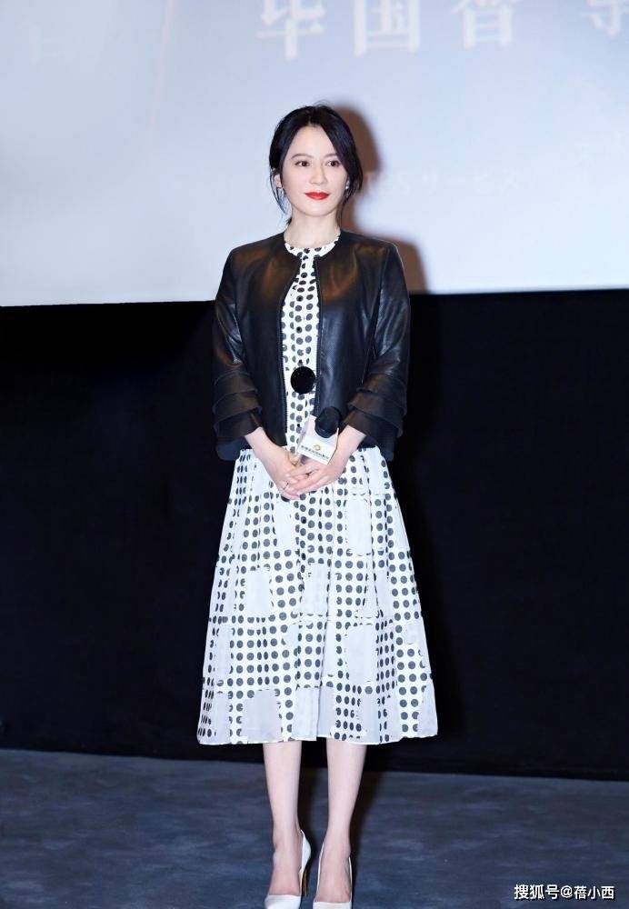 俞飞鸿这身穿搭采用了叠穿技巧,上半身搭了一件黑色外套,其看上去是皮质面料,摸起来不仅光滑,质感也好得没话说。此外套没有翻领设计,脖子不仅更清爽,人也多了一份干练感。此外,短款外套不管是搭裤子还是裙子,都能在视觉上抬高穿着者腰线。再来将目光放在内搭上,其是融入黑色元素的连衣裙,裙子领口较小,与外套相呼应。裙身以白色为底层面料,其上印有黑色圆点,让裙子看上去更精致了。