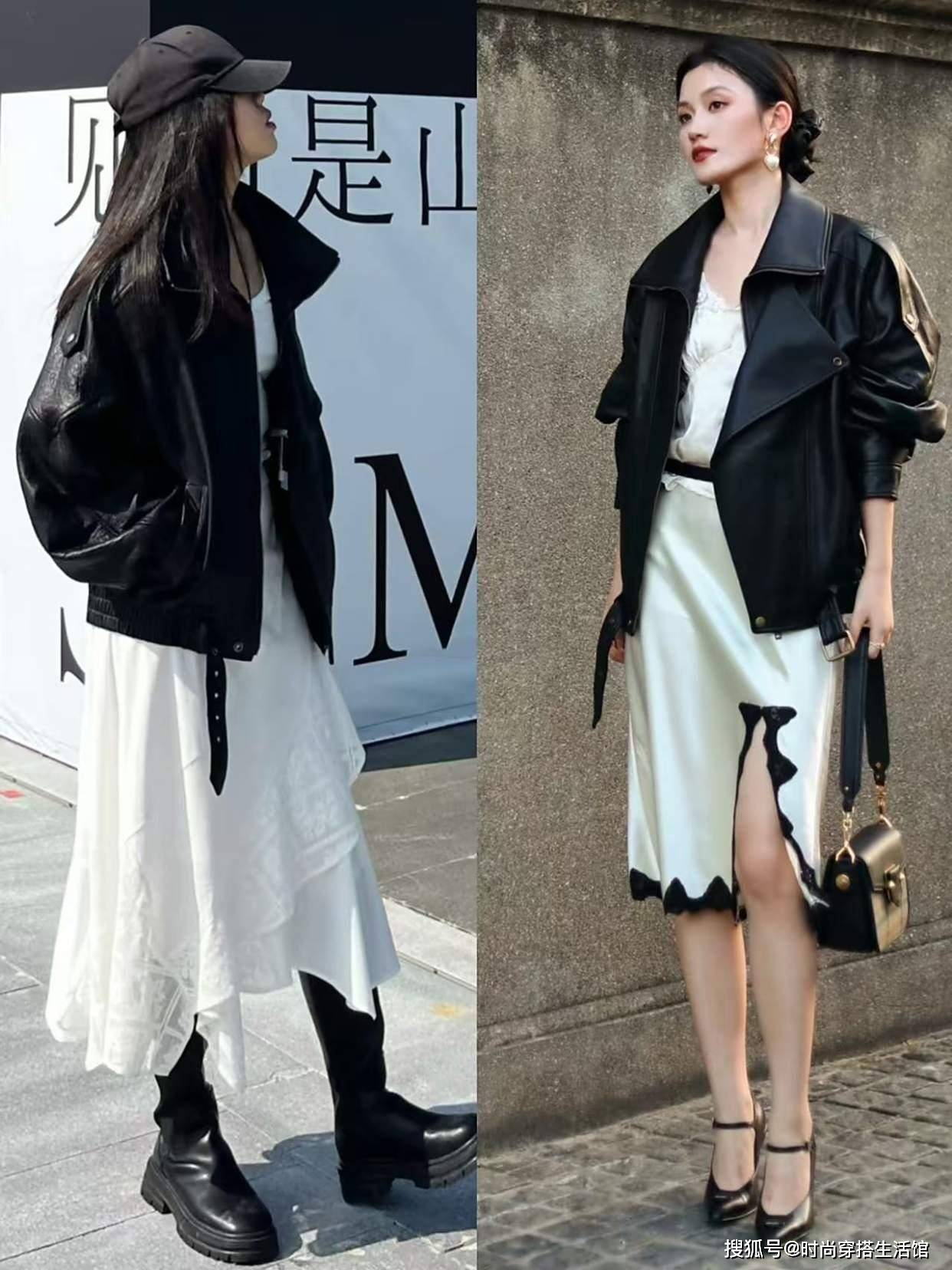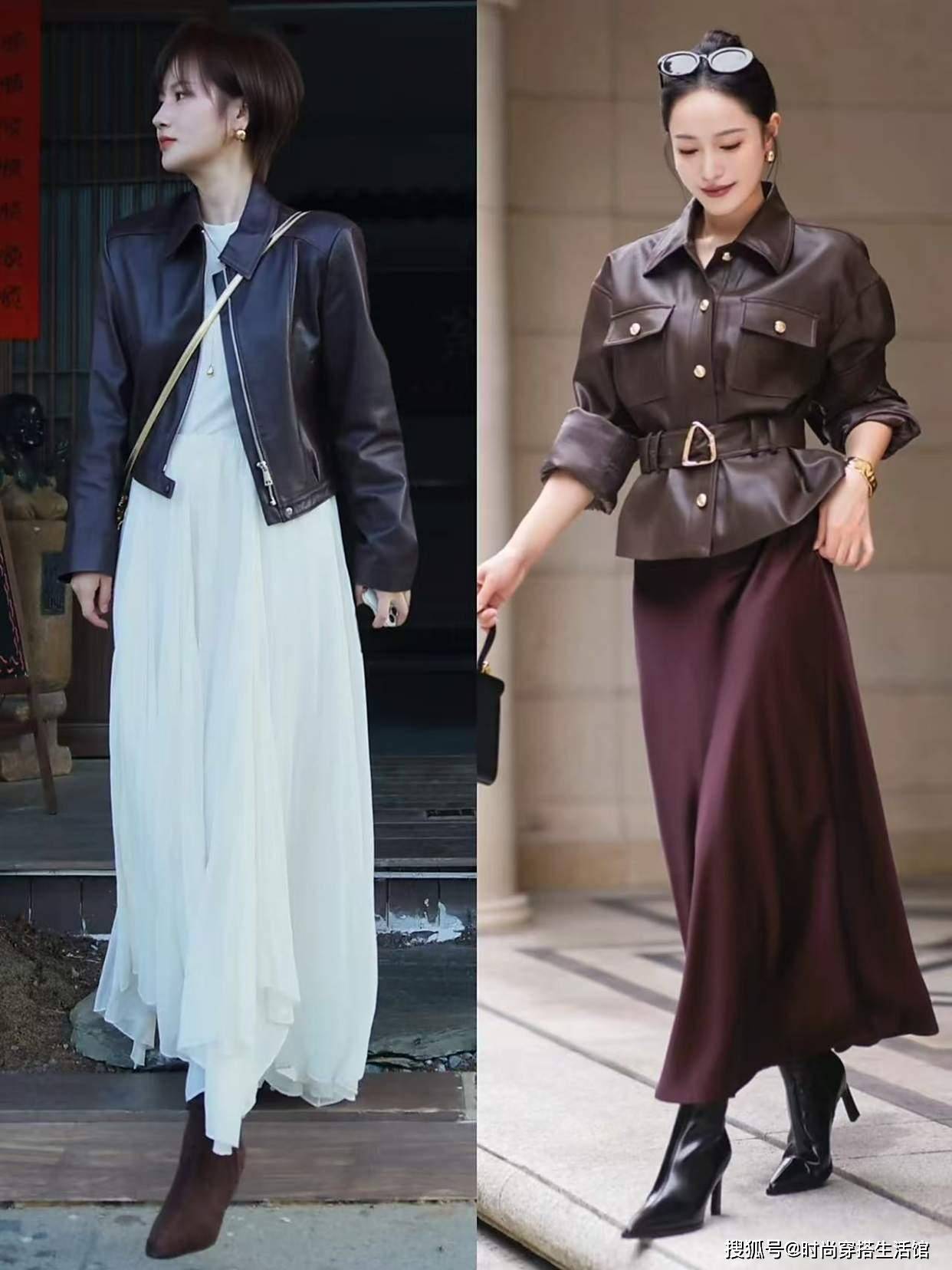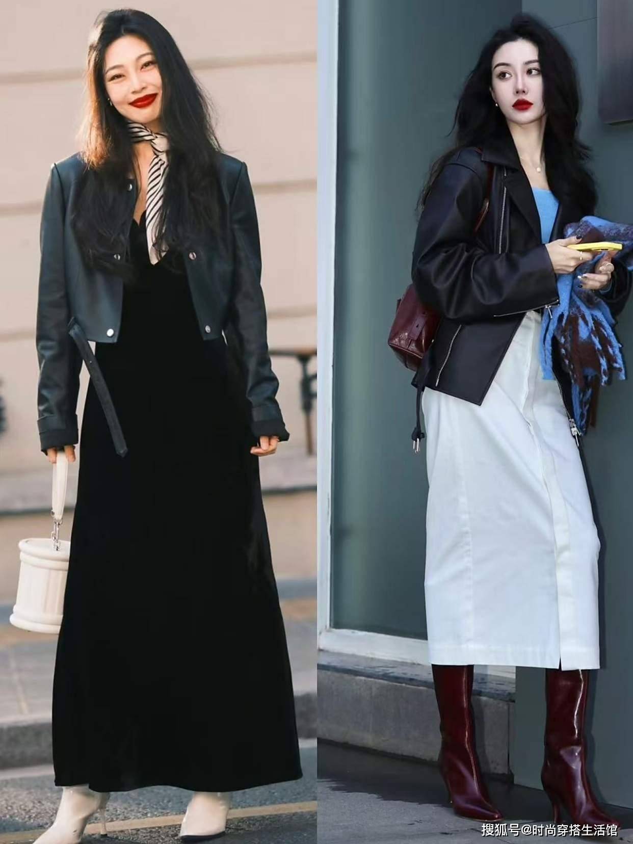 今年秋天火了一种穿法:皮衣+裙子,又美又飒,比你想象中更好看