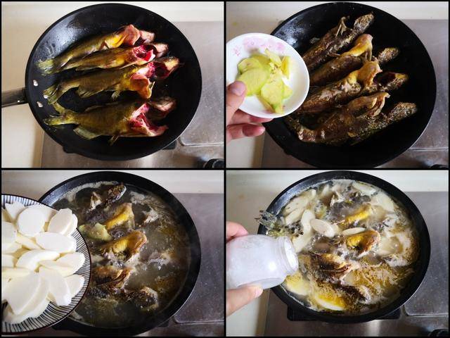 制作过程: 将铁棍山药去皮后切成片备用; 烧热锅放入适量的油,将处理好的黄骨鱼放进锅中去煎,一面煎至金黄后翻面将另一面也煎至金黄, 加入少许姜片继续煎一下, 加入适量的水炖煮,再放入准备好的山药片放进锅中一起煮,煮至鱼汤奶白后加入少许盐和胡椒粉调味, 最后放入少许葱花即可。