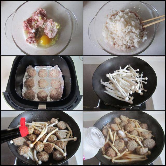 制作过程: 将莲藕去皮后切成小丁备用。肉末中加入少许盐、料酒、生抽、淀粉和姜末等调味料顺着一个方向搅拌上劲,再加入同等的莲藕丁放进肉末中同一方向搅拌均匀。 将腌制入味的莲藕丸子放入空气炸锅中炸熟定型(用空气炸锅比油炸更加省油更健康)。烧热锅放入适量的油,加入海鲜菇放进锅中翻炒几下,加入准备好的莲藕丸子放进锅中翻炒两下,加入少许生抽翻炒上色,加入适量的水炖煮三至五分钟,最后加入少许盐和胡椒粉调味,大火收汁后撒入少许葱花即可。