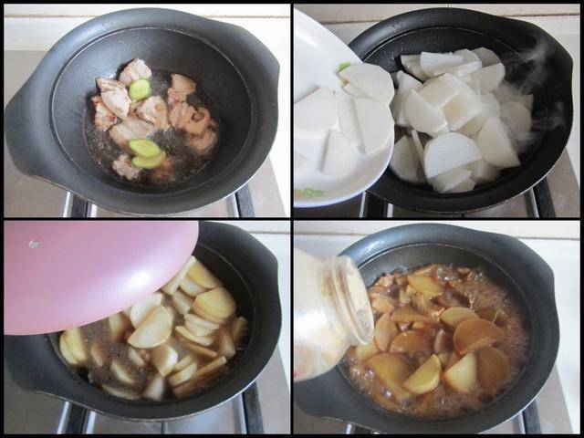 制作过程: 将白萝卜去皮后切成片备用; 五花肉切成片备用。 烧热锅放入少许油, 将五花肉片放进锅中煸炒至微微出油, 加入少许姜片翻炒两下,加入白萝卜片放进锅中翻炒两下,加入少许料酒和生抽翻炒均匀,加入适量的水加盖炖煮, 炖煮五分钟后加入少许盐调味,大火收汁,最后加入少许青蒜和红椒翻炒均匀即可。
