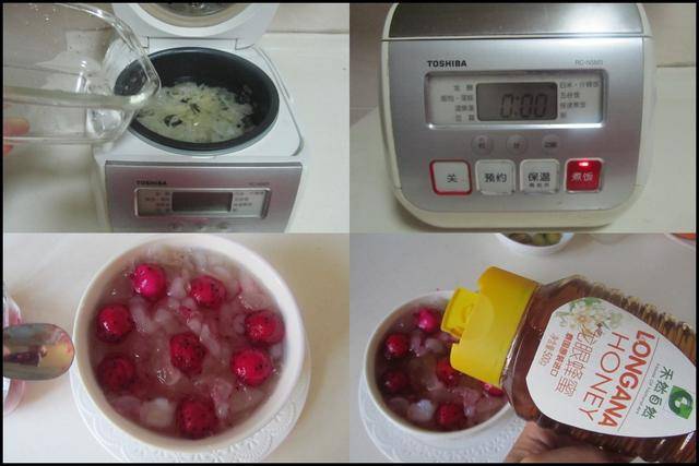 制作过程: 将干银耳用冷水泡软,再剪成小碎粒备用。 将银耳碎放入电炖锅中,加入适量的水,按下电炖锅上炖煮的功能键。 炖煮好后待其微微凉, 加入准备好的火龙果和蜂蜜融化即可。