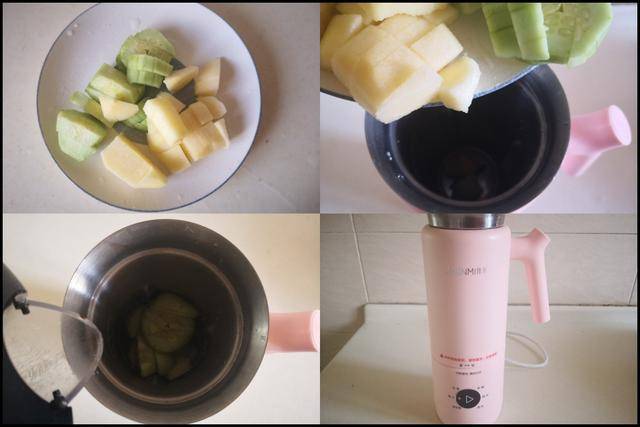 制作过程:将洗净的苹果和黄瓜去皮后切成小块,再将准备好的苹果块和黄瓜块放入破壁豆浆机中,按豆浆机刻度线上加入适量的凉白开水,按下豆浆机制作果汁的功能键 时间到,“苹果黄瓜汁”就 完成了。