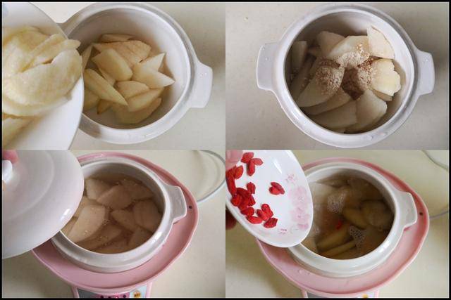 制作过程:将川贝放入小罐中捣碎; 将洗净的雪梨去皮后切成片后放入电炖盅里,再将川贝放入小罐中捣碎的川贝粉放入炖盅,加入适量的水,加盖后炖煮1个小时,待还剩余15分钟时加入少许冰糖和枸杞继续炖煮即可。