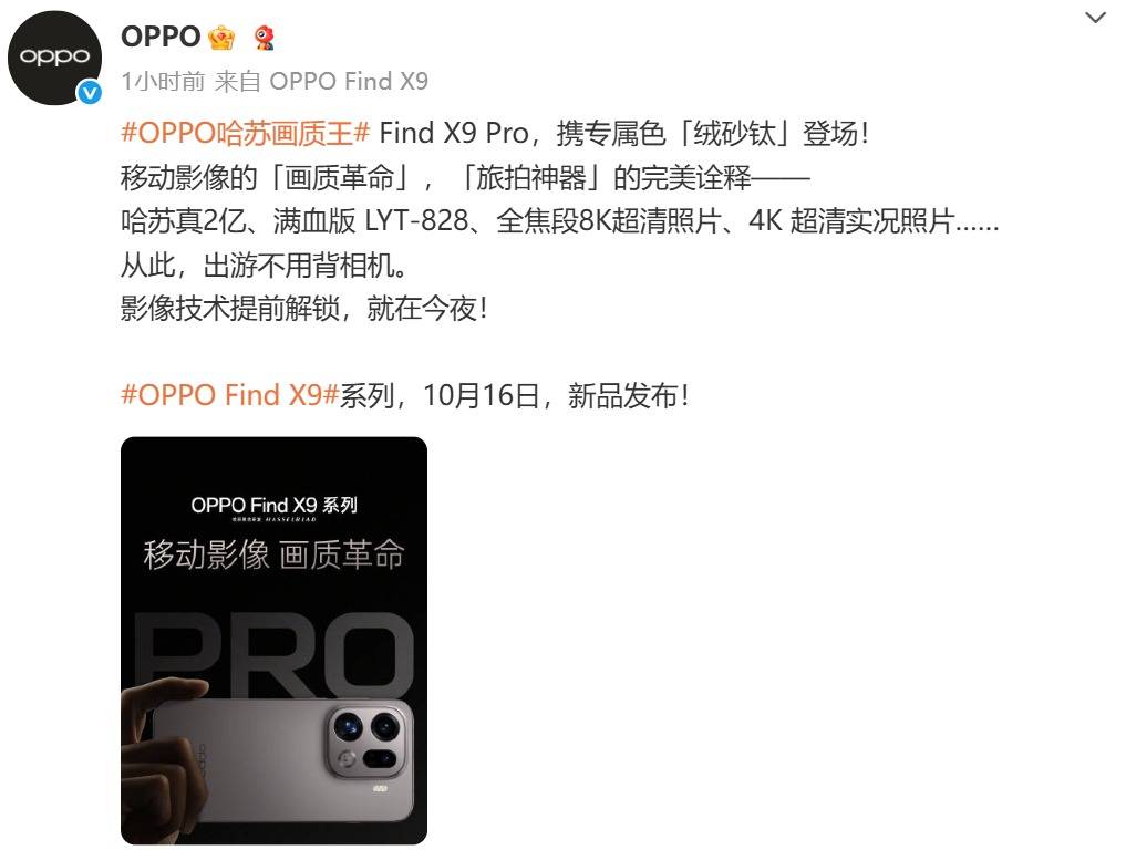 往后便是10月16日发布的9系列旗舰新机,官方称之为移动影像的「画质革命」与「旅拍神器」的完美诠释。Find X9系列首批搭载天玑9500芯片,并结合自研的全新一代潮汐架构引擎,全面释放平台性能潜力;在系统层面,首发ColorOS16,流畅度与能效优化显著提升,同时延续Find系列一贯的设计美学与影像实力。Pro版本影像更是搭载哈苏真2亿、满血版LYT-828、全焦段8K超清照片、4K超清实况照片等顶级配置,让用户从此出游无需背相机。更有超过7000mAh的大容量冰川电池,为持久续航提供保障。性能突破、强悍影像、长续航与系统优化相辅相成,共同构筑Find X9系列的顶级旗舰体验。