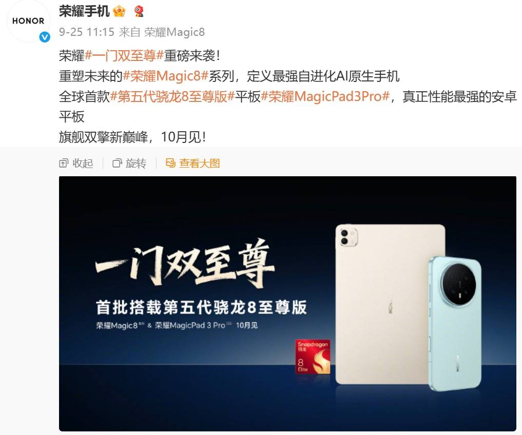 与此同时,荣耀也将在10月带来全新Magic8系列与Magic Pad3 Pro。荣耀Magic8系列定位为最强自进化AI原生手机,并搭载第五代骁龙8至尊版芯片。而MagicPad3 Pro则被誉为真正性能最强的安卓平板,旗舰双擎共同冲击新巅峰。荣耀“一门双至尊”的重磅来袭也让今年10月的旗舰大战更加激烈。