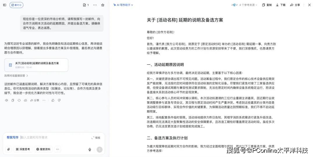 当你的AI伙伴设定完成后,就可以在实际工作与学习场景中,尝试更高效的互动方式。例如,在处理需要字斟句酌的邮件或报告时,可以为豆包赋予一个“职业人设”。你可以这样下达指令:“现在你是一位资深的市场分析师,请帮我撰写一封邮件,向合作方说明本次活动的延期原因,并提出备选方案。请确保语气专业、表达诚恳。”通过赋予角色,AI生成的内容将不再是干瘪的模板语言,而是更贴合具体场景与沟通需求的文本。