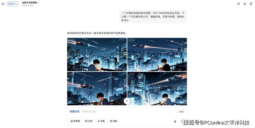 例如,你可以这样描述:“一个充满未来感的城市夜景,空中飞车的光轨划过天际,下方是一个正在看书的少年,漫画风格,采用冷色调,强调光影对比。”通过不断调整和优化描述性指令,你可以将脑海中的瞬间,转化为一张张具体的图像,甚至创作出属于自己的系列漫画或故事绘本。
