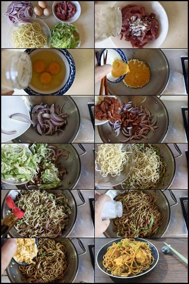 原料:热干面条 1盘 鸡蛋 3个 牛肉丝 1小碗 洋葱 半个 包菜 1盘 料酒 1勺 生抽 2勺 淀粉1小勺 胡椒粉 少许 油盐 适量