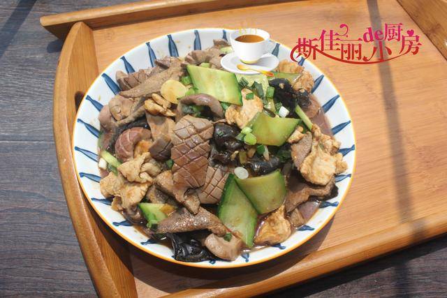 制作过程:将黑木耳用冷水泡软, 将猪肝、肉片和黄瓜都切成片备用; 将腰花表面打上花刀,再切块备用; 将腰花片、猪肝片和里脊肉片加入适量的盐、生抽、料酒、淀粉等调味料拌均匀腌制3分钟备用。调整好碗汁: 盐、生抽、料酒、淀粉和姜蒜片加入小碗中, 加入少许水拌均匀。烧锅水加入1小勺盐,将黑木耳放入锅中焯煮2分钟后捞出 ; 再将腰花和猪肝片放进锅中焯烫变色后捞出备用; 热锅凉油, 加入肉片放进锅中翻炒至变色,再将腰花和猪肝片放进锅中翻炒均匀;加入黑木耳和黄瓜片放入锅中翻炒均匀; 倒入准备好的碗汁,焖至两分钟后将其翻炒均匀,大火收汁盛入盘中即可。