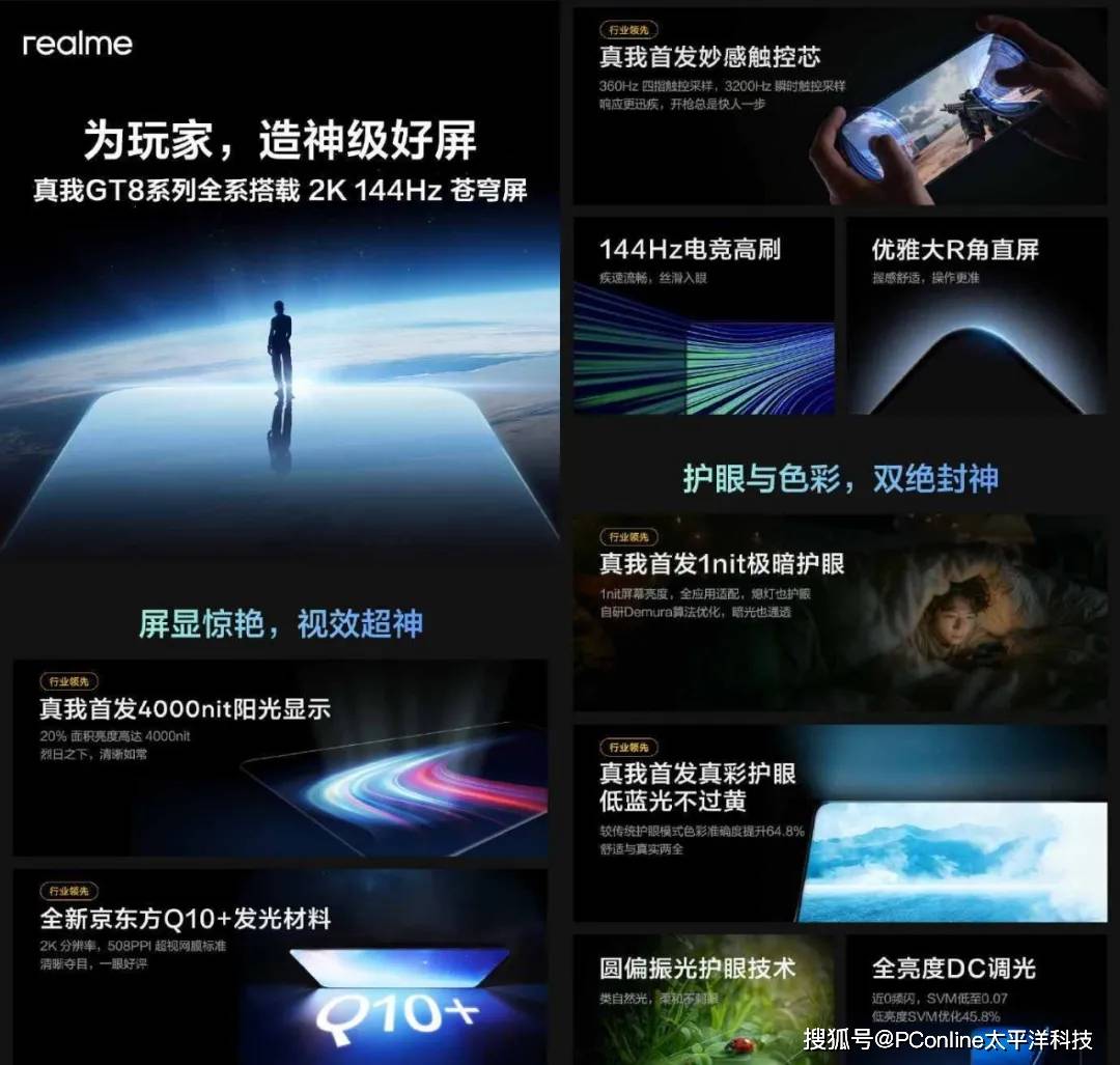 真我GT8全系搭载京东方Q10+发光材料的2K直屏,144Hz高刷新率,采用视觉四等边+大R角设计,支持3D超声波指纹。