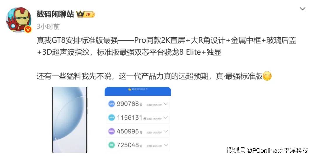 据博主“数码闲聊站”爆料,真我GT8标准版搭载骁龙8 Elite+独显芯片,安兔兔跑分约332万分。作为参考,上代真我GT7搭载天玑9400+处理器,官方宣称的安兔兔跑分同样超过300万分。