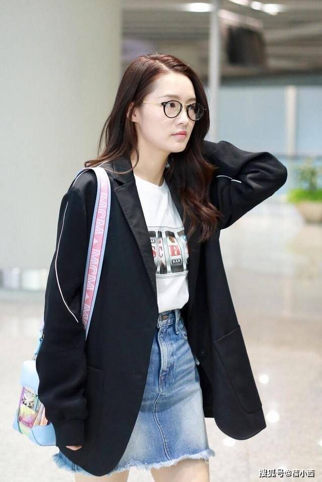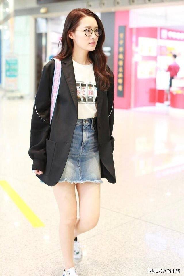 下装的牛仔短裙是造型的点睛之笔,浅蓝牛仔的清新与黑色西装的酷感形成了色彩反差,毛边设计增添了几分随性不羁。脚上的白色运动鞋舒适百搭,与整体风格完美契合。再配上黑框眼镜,多了几分知性文艺感,35岁的李沁用这套穿搭展现出了可盐可甜的机场时尚,将正式与休闲、酷感与甜美完美融合起来,太洋气了!