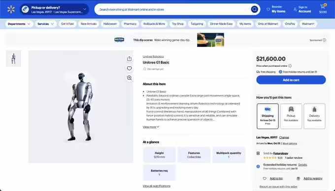 【太平洋科技快讯】10 月 9 日消息,近日,中国宇树科技公司的人形机器人 G1 上架美国沃尔玛网站,基础款售价 21600 美元(约合 15.4 万元人民币),这一售价较国内 9.9 万元的价格高出 55%,支持免费配送,单次最多可订购六台。