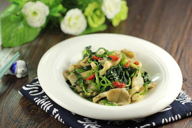 第四种:菠菜,菠菜被誉为“营养模范生”,营养丰富, 富含钾、铁、维生素C及叶酸等多种营养成分,有助于增强免疫力、养肝明目等功效, 它也是高钾菜中的“明星选手”,将它搭配上平菇一起炒,简单不乏营养,清爽不油腻,日常餐桌上常备。 不过菠菜中含有草酸,烹饪之前要提前焯水去除。