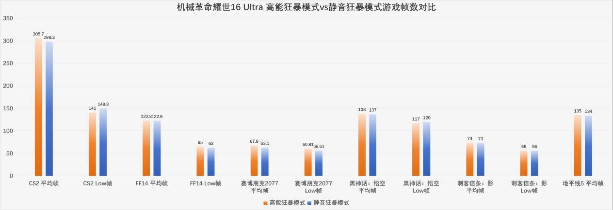 关键是,游戏体验几乎没差!“高能狂暴模式”平均305帧,“静音狂暴模式”平均298帧,这点差距在实际游戏中根本感觉不到,依旧是丝般顺滑。