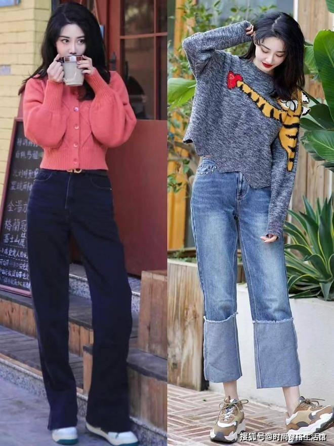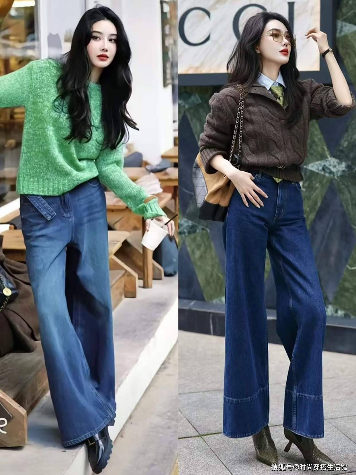 关于秋天毛衣的最佳搭配组合当属牛仔阔腿裤,毕竟牛仔裤是裤子中的“常青树”,搭配上宽松的版型,能够完美的穿出一种慵懒随性的高级感,尤其是搭配上纯色毛衣的时候,上下搭配之间色彩相互对比,能够完美展现出干练潇洒的气质,视觉上显高显腿长。