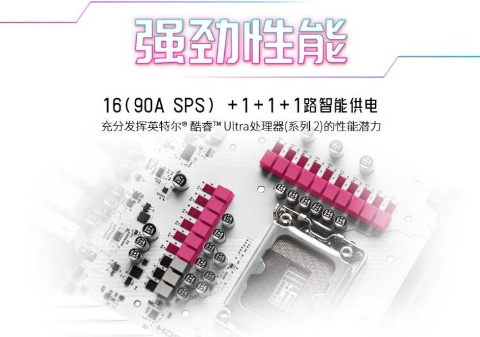 Z890 EDGE TI WIFI支持最新的DDR5内存标准,官方标称可超频至9200MHz以上,几乎站在了现有消费级主板的顶峰。为应对Intel高功耗的特性,微星采用了强化的多相供电架构与更厚实的散热模组,16+1+1+1相智能供电能够确保在运行Ultra 200S处理器时仍能保持稳定。