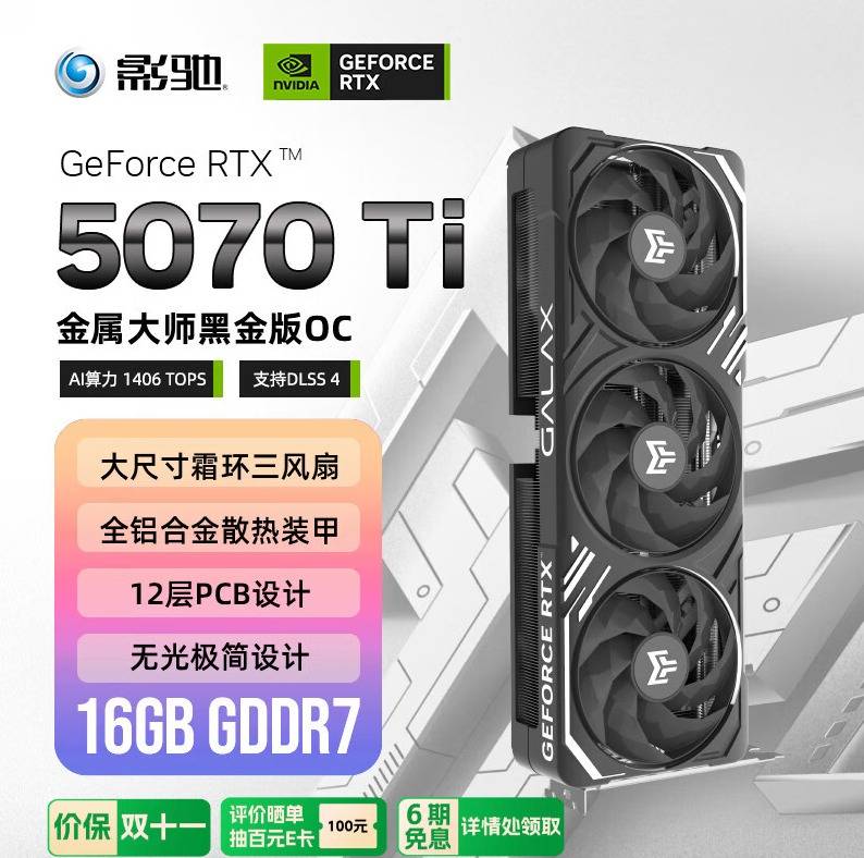 目前正值双十一购物狂欢节点,更是入手影驰GeForce RTX 5070 Ti金属大师 白金版 OC的好时机。现在京东平台到手价仅需6799元,并且价保双十一!玩家不仅有机会享受6期免息,评价晒单更有机会抽中百元E卡!赶紧戳下方链接购买吧~