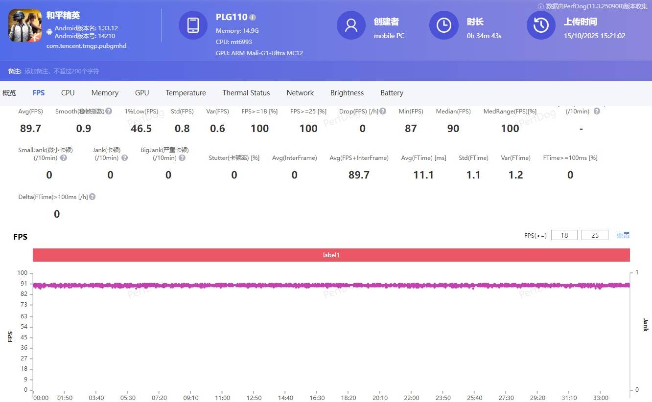 接下来来到压力稍大的FPS游戏和平精英,开启HDR高清和90帧选项。半小时游戏下来,除去局外帧率后平均帧为89.7帧,帧率依旧是一条直线。平均功耗为3875mW(3.8W),依旧稳如磐石,看来OPPO这次对Find X9的调校还是相当不错的。