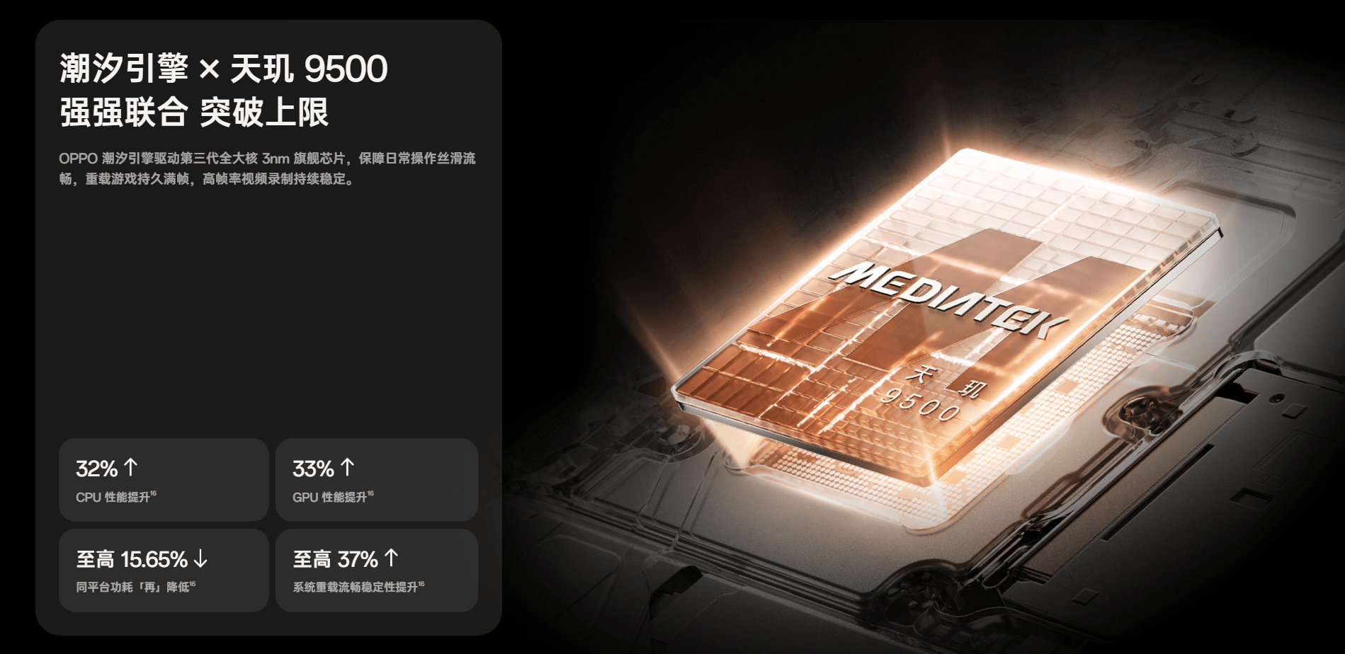 性能上面自然也不落后,OPPO Find X9 Pro搭载了天玑9500,配合OPPO潮汐引擎,提供顶级的性能表现。天玑9500不仅优化了CPU、GPU和NPU性能,还通过全新的动态追帧技术和可编程调度器,在运行大型游戏时能够确保5小时满帧稳定运行,带来无与伦比的流畅体验。