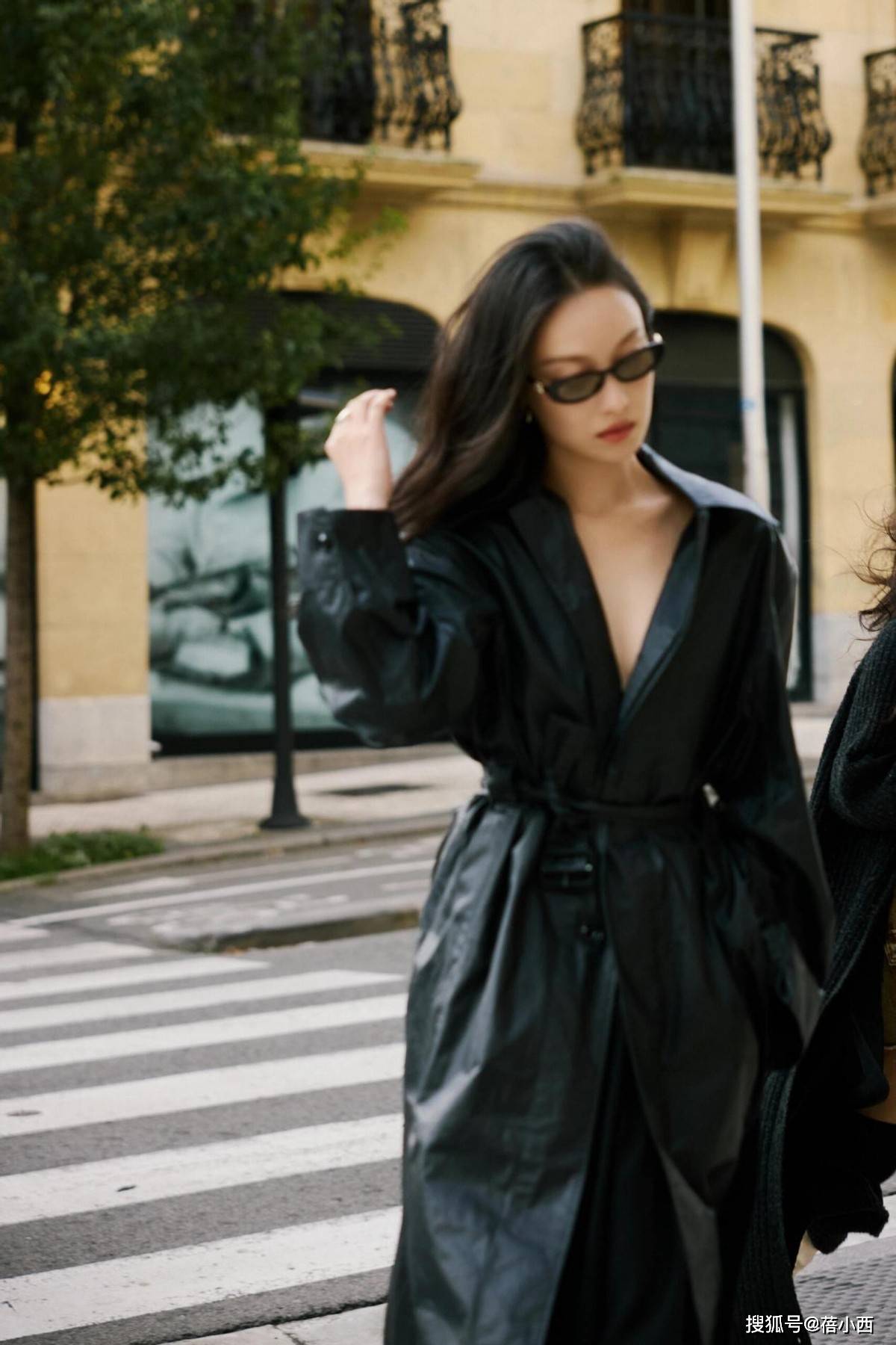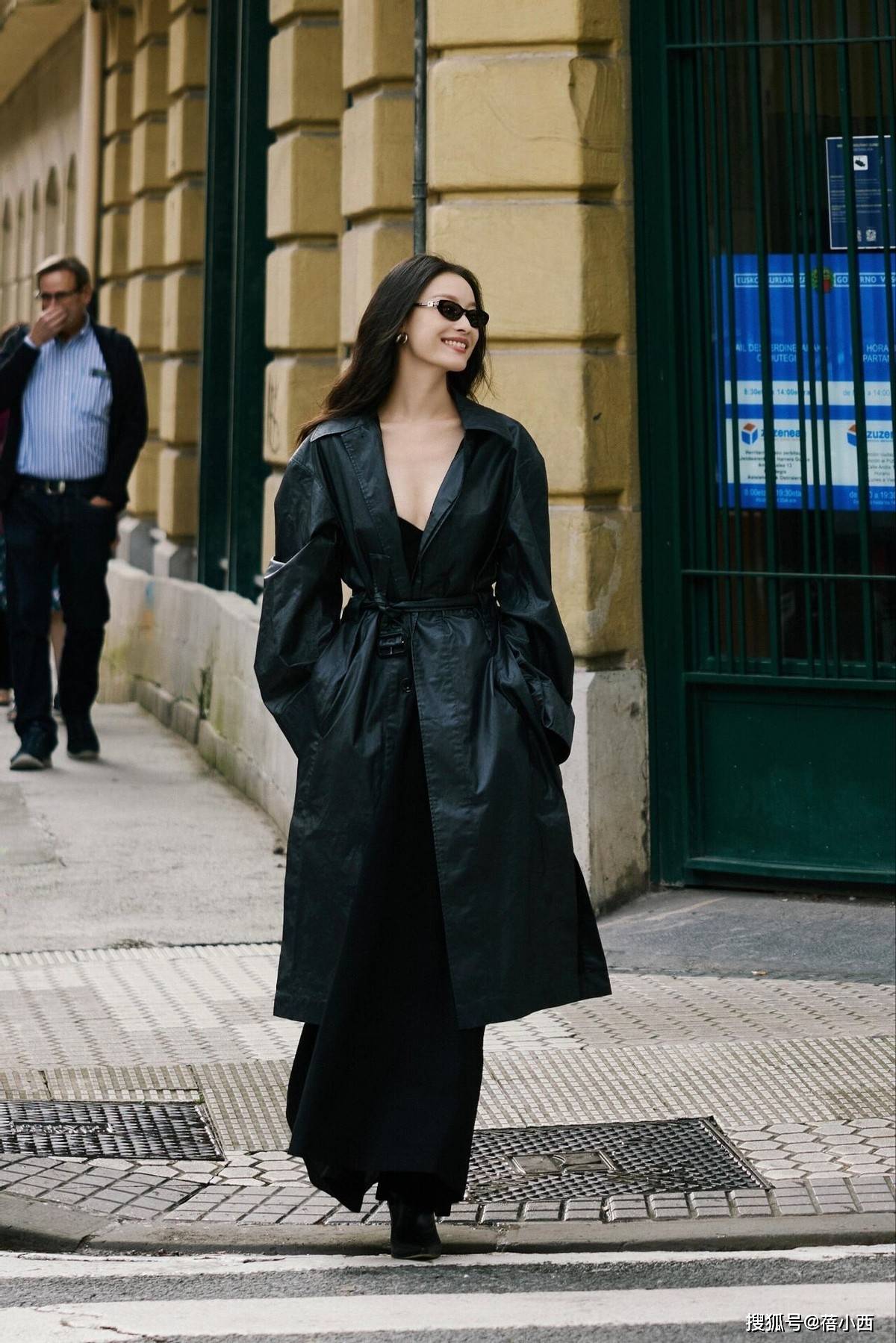 黑色风衣配阔腿裤的造型更是让人眼前一亮。全黑的搭配看似简单,实则暗藏玄机。风衣的长度刚好到小腿肚,阔腿裤的裤脚微微盖住鞋面,这种比例拿捏得恰到好处,再加上阔腿裤的垂坠感让整个人看起来更加修长,走路时裤腿随风摆动,气场两米八。如果你想要通过最简单的搭配呈现出最时髦的效果,也可以试试这种同色系搭配哦。