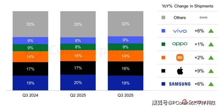 而在OPPO Find X9系列火爆的首销背后,市场调研机构Counterpoint最新报告指出,2025年第三季度全球智能手机出货量同比增长4%,其中OPPO稳居全球第四。