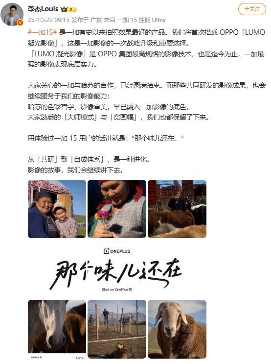 10月22日消息,据一加中国区总裁@李杰Louis透露,一加宣布即将推出的一加 15,将首发搭载OPPO最高规格的影像技术——「LUMO 凝光影像」。这标志着一加影像进入全新阶段,也是一加影像战略的重要升级与转折点。