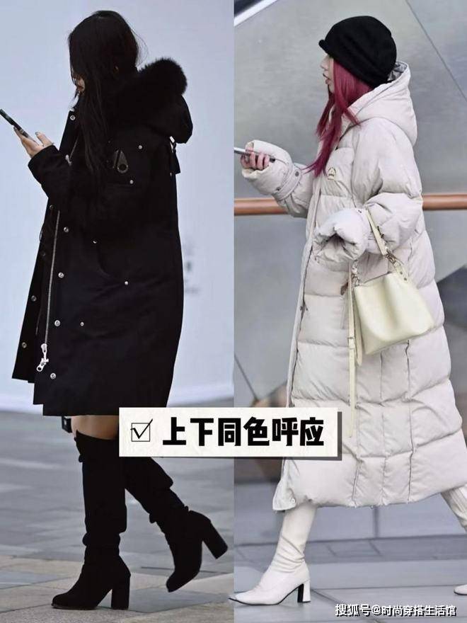 其次降温后对于北方城市的小姐姐来说长大衣的保暖度可能不够强,那么我们还可以选择长款羽绒服;脚上搭配同色系的长筒靴,也能让我们的整个造型变得更加时髦和高级。对于秋冬季节来说我们选择的长羽绒服和长靴尽量纯色,要避免选择花哨和鲜艳的色彩,从而暴露身材缺点。