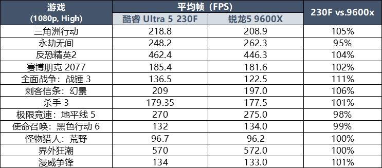 在大多数游戏中,酷睿Ultra 5 230F都能小胜锐龙5 9600X,其中在《三角洲行动》、《反恐精英2》这种热门网游,也是很多游戏博主集中选择的FPS电竞游戏中,优势更加突出。