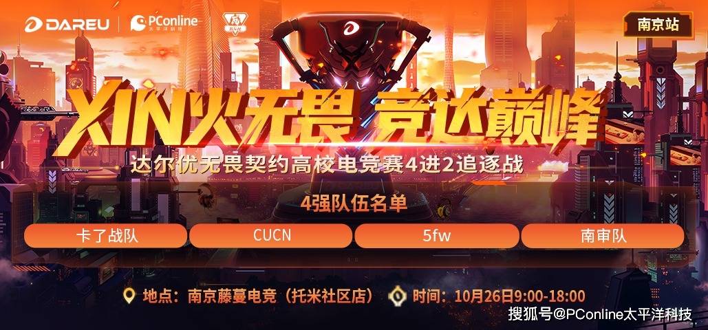 金陵古城,电竞风云再起。10月18日达尔优&太平洋科技无畏契约高校电竞赛南京赛区,经历线下12进4的激烈争夺,卡了战队、CUCN、5fw、南审队,成功晋级四强战队。10月26日,这四支精英队伍将再度集结,进行4进2的精彩对决。