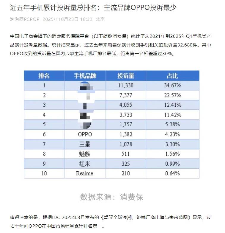 除了销量领先,OPPO在用户口碑与售后体验方面同样表现卓越。根据中国电子商会旗下“消费保”平台发布的最新数据,在过去五年的品牌投诉统计中,OPPO投诉量仅占比仅为4.23%,比排名第一的品牌低超30%。这充分体现出OPPO在品质管控、售后响应与用户满意度方面的长期积累与优势,也为Find X9系列的火爆首销提供了坚实信任基础。