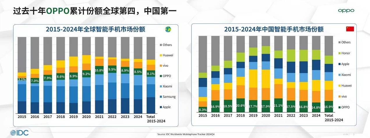 从市场表现来看,OPPO Find X9系列的亮眼成绩并非偶然。根据IDC《驾驭全球浪潮,终端厂商出海与未来蓝图》报告显示,过去十年间,OPPO在中国市场销量累计排名第一,全球市场份额位居第四。凭借在产品研发、渠道体系与品牌价值上的深耕,OPPO持续保持强劲的全球竞争力。