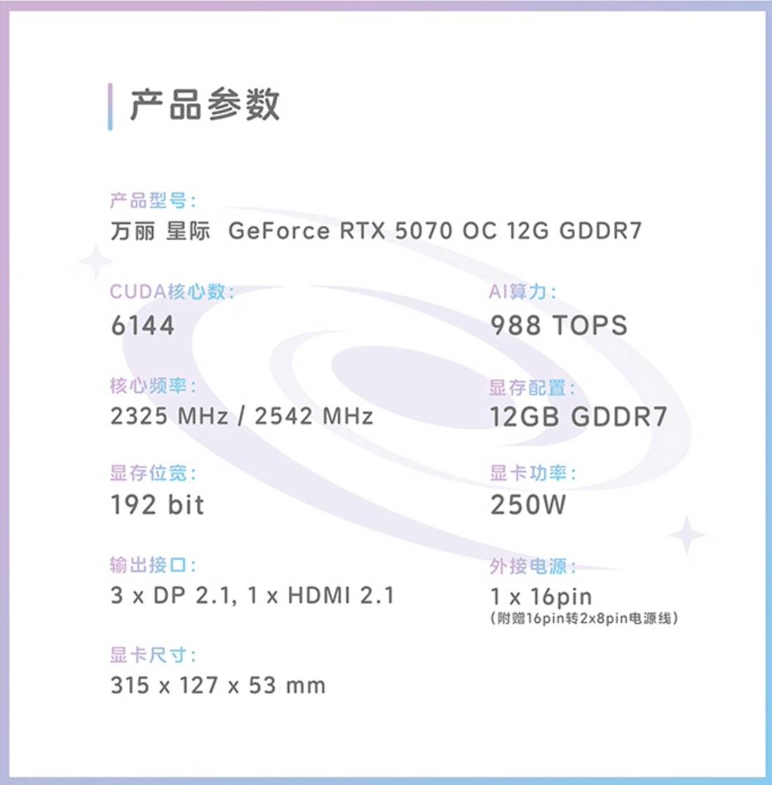 如果你是一位追求2K分辨率下流畅游戏体验的玩家,或是需要进行视频编辑、AI创作、图形设计等工作的内容创作者,万丽Geforce RTX 5070 OC 12GB星际显卡将是你的理想之选。