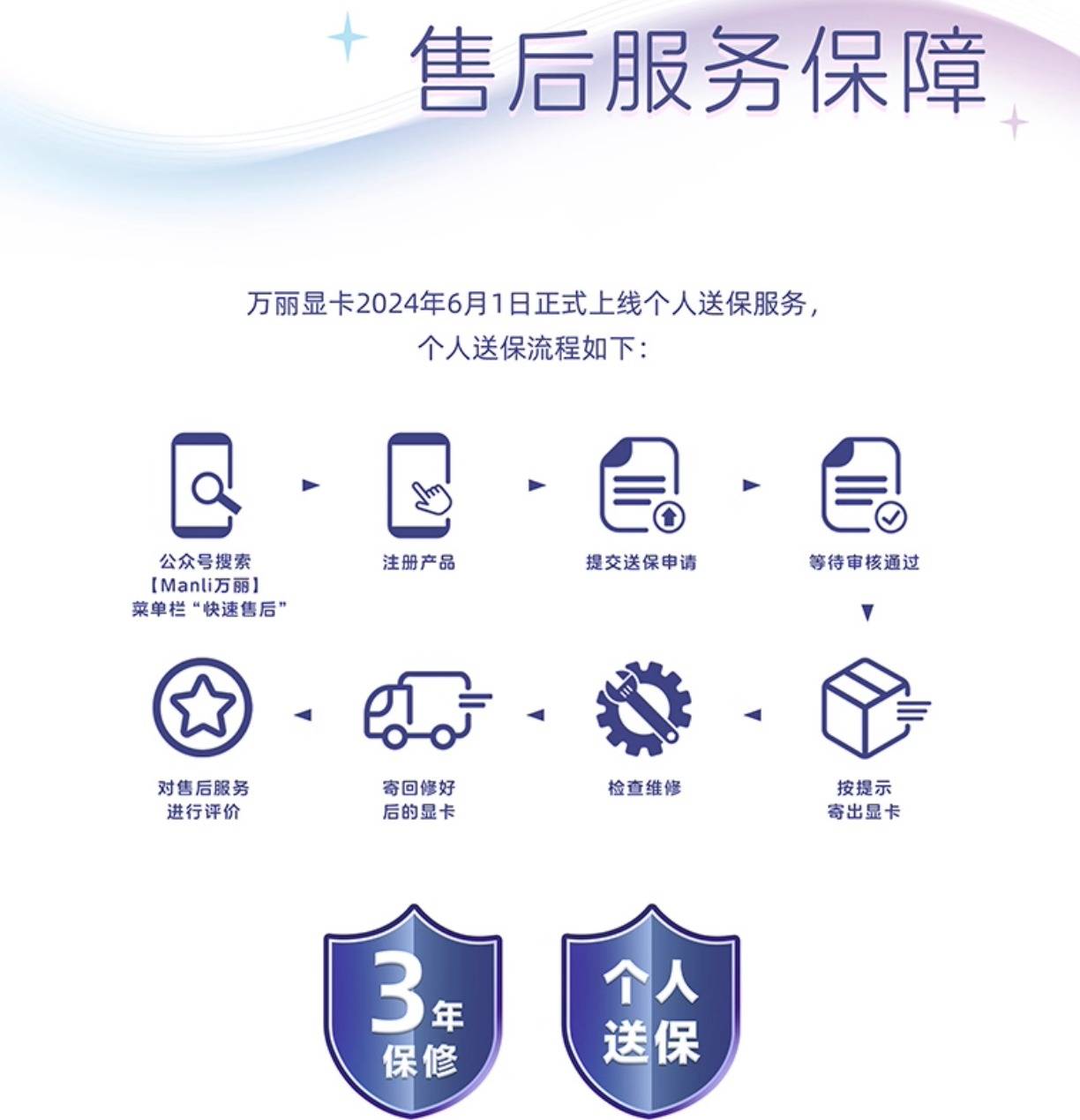 万丽显卡自2024年6月1日起正式上线个人送保服务,提供三年保修支持。用户只需通过微信公众号“Manli万丽”即可完成注册产品、提交送保申请等流程,售后服务便捷可靠。